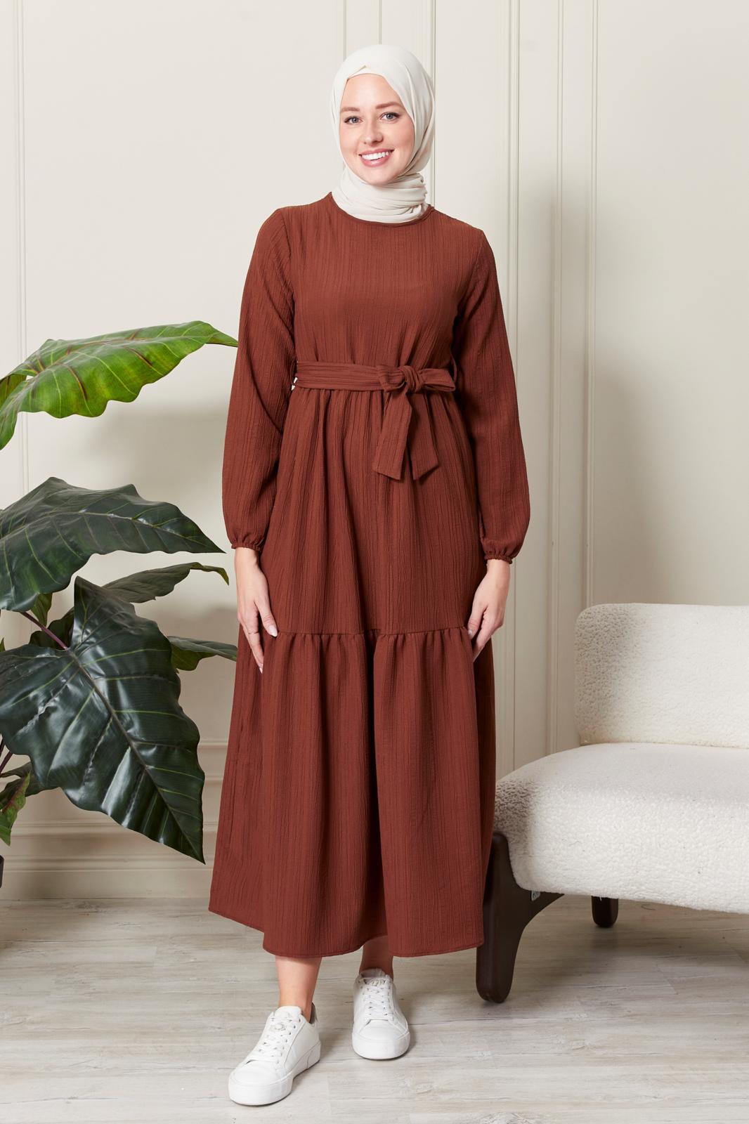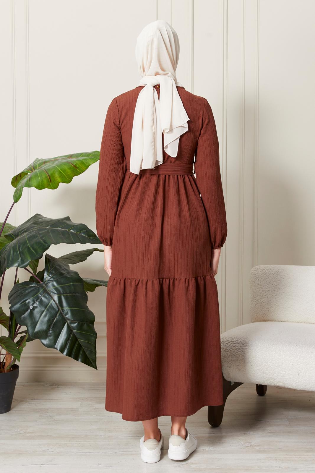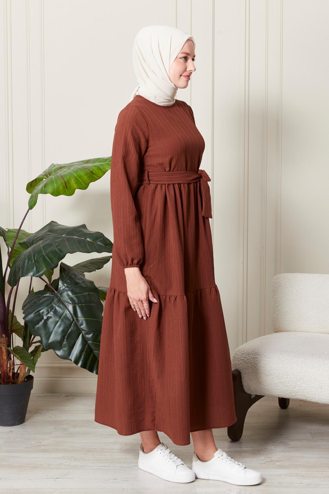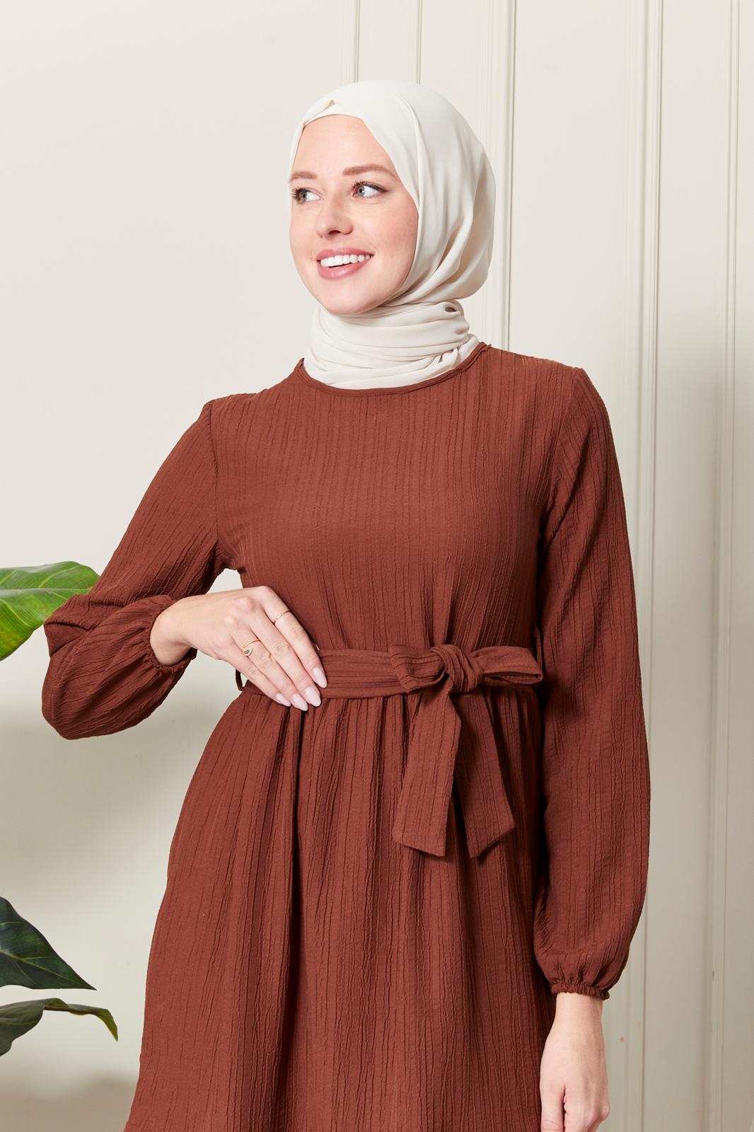 Yeni sezon elbisemiz sade tarzıyla dikkat çekmektedir. Elbisemizin kendi kumaşından kuşağı bulunmaktadır. Ensesinde düğmesi olan elbisemizin bilekleri lastiklidir. Renk seçenekleri mevcuttur.